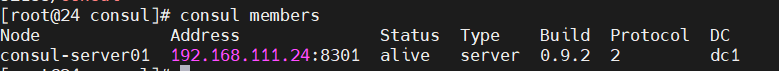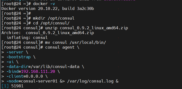 consul agent \ -server \ -bootstrap \ -ui \ -data-dir=/var/lib/consul-data \ -bind=192.168.111.24 \ -client=0.0.0.0 \ -node=consul-server01 &> /var/log/consul.log &