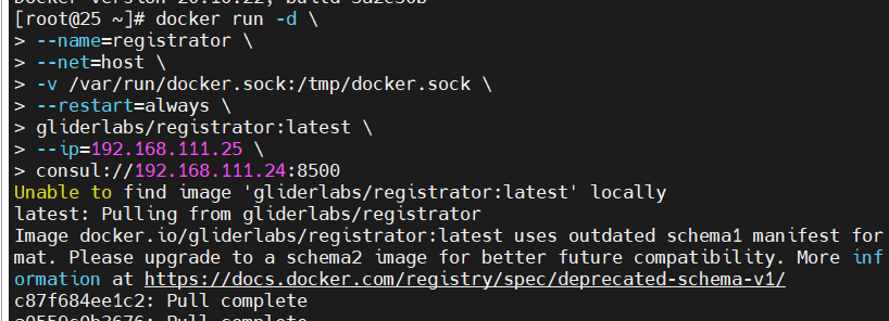 docker run -d \ > --name=registrator \ > --net=host \ > -v /var/run/docker.sock:/tmp/docker.sock \ > --restart=always \ > gliderlabs/registrator:latest \ > --ip=192.168.111.25 \ > consul://192.168.111.24:8500