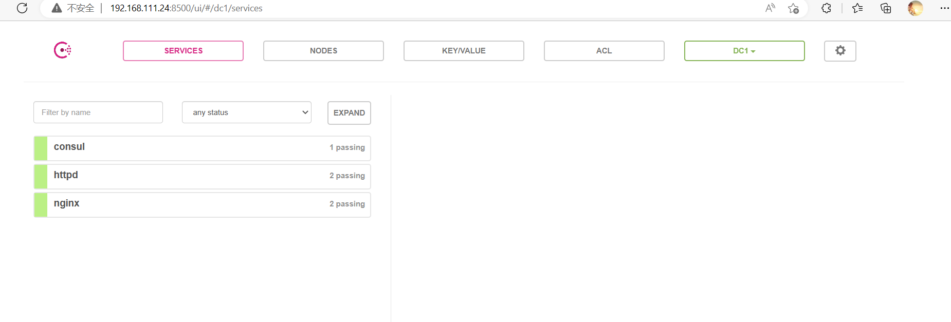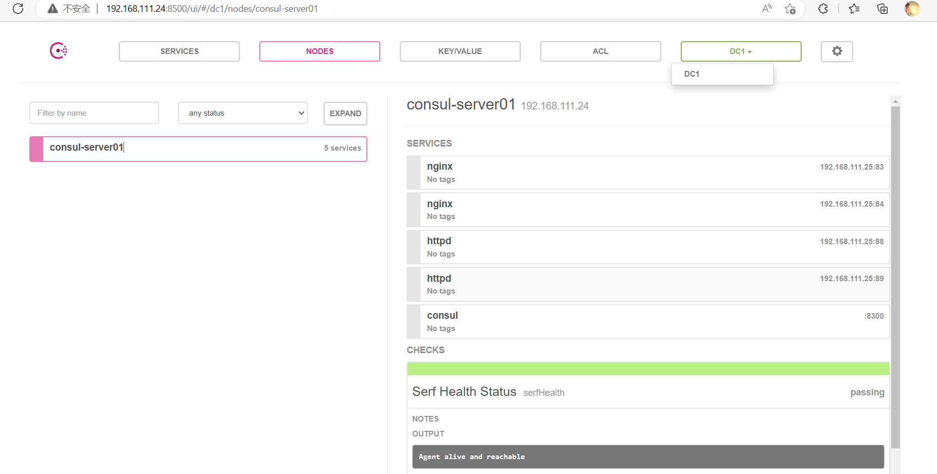 浏览器中,输入 http://192.168.111.24:8500,在 Web 页面中“单击 NODES”,然后单击“consurl-server01”,会出现 5 个服务。