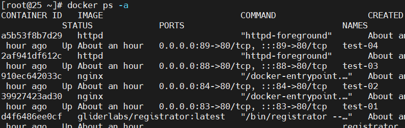docker run -itd -p:83:80 --name test-01 -h test01 nginx docker run -itd -p:84:80 --name test-02 -h test02 nginx docker run -itd -p:88:80 --name test-03 -h test03 httpd docker run -itd -p:89:80 --name test-04 -h test04 httpd