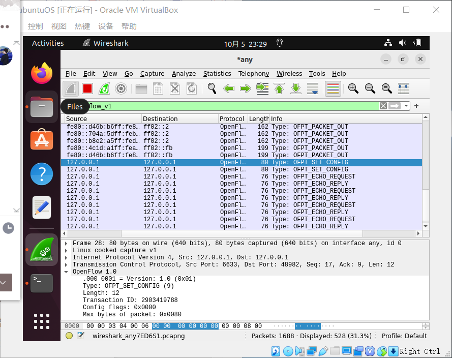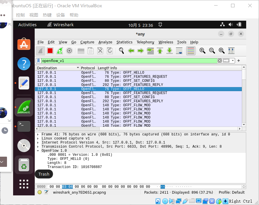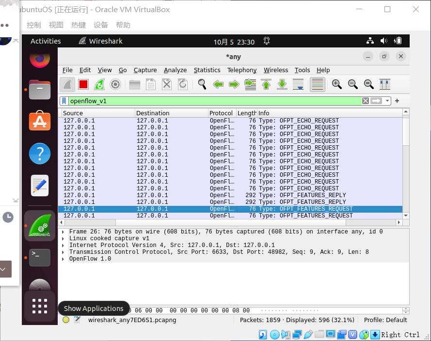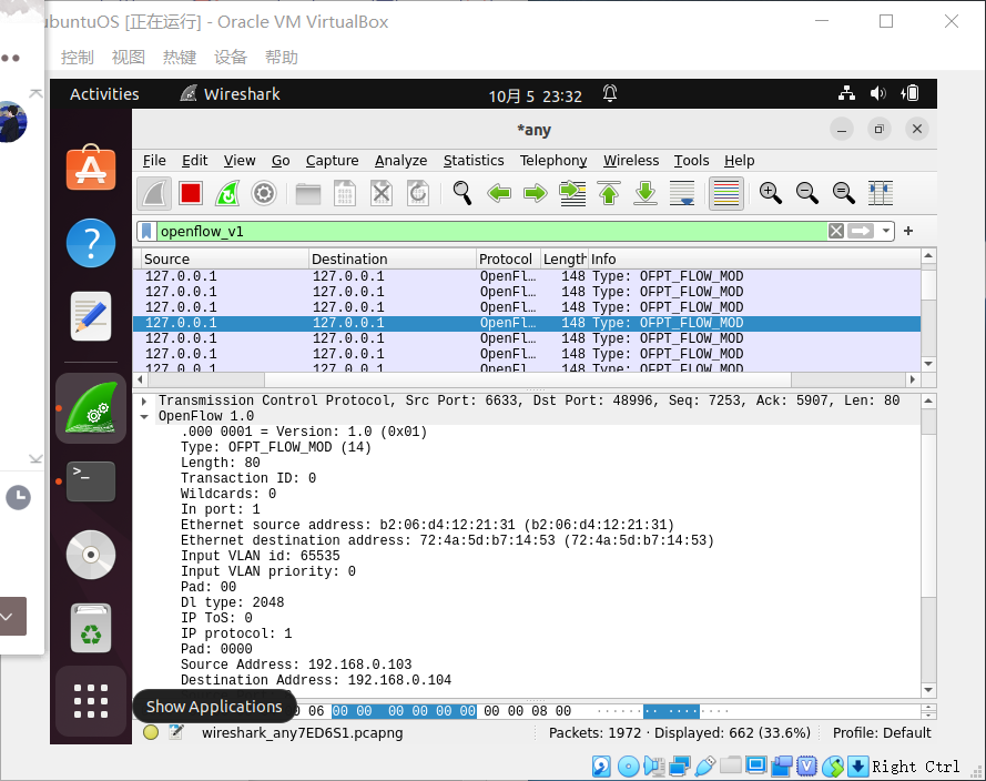 1、能够运用 wireshark 对 OpenFlow 协议数据交互过程进行抓包;
