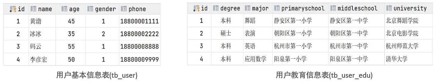 关系:一对一关系。多用于单表拆分,将一张表的基础字段放在一张表中。其他详情字段放在另一张表中,以提升操作效率