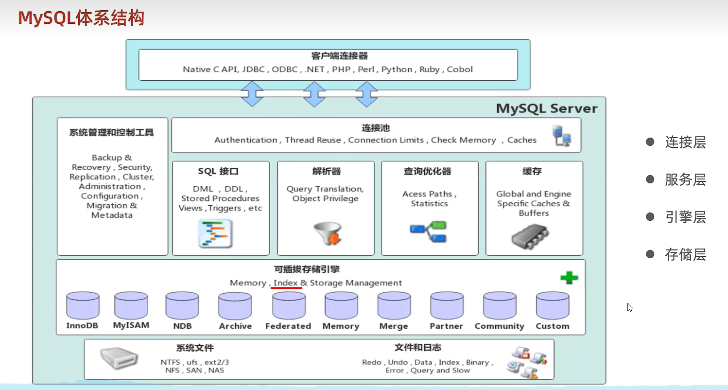 连接层:最上层是一些客户端和链接服务,主要完成一些连接处理,授权认证,以及相关的安全方案,服务器也会为安全接入的每一个客户端验证它所具有的操作权限