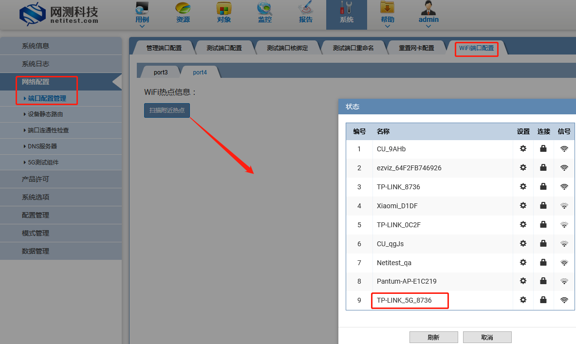 选择wifi网口port4,扫描附近热点。