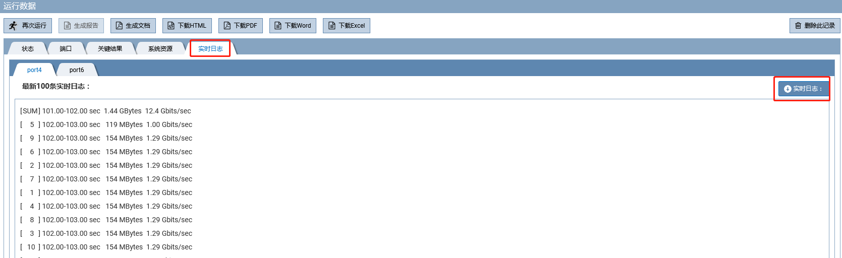 实时日志记录了测试过程中的数据。
