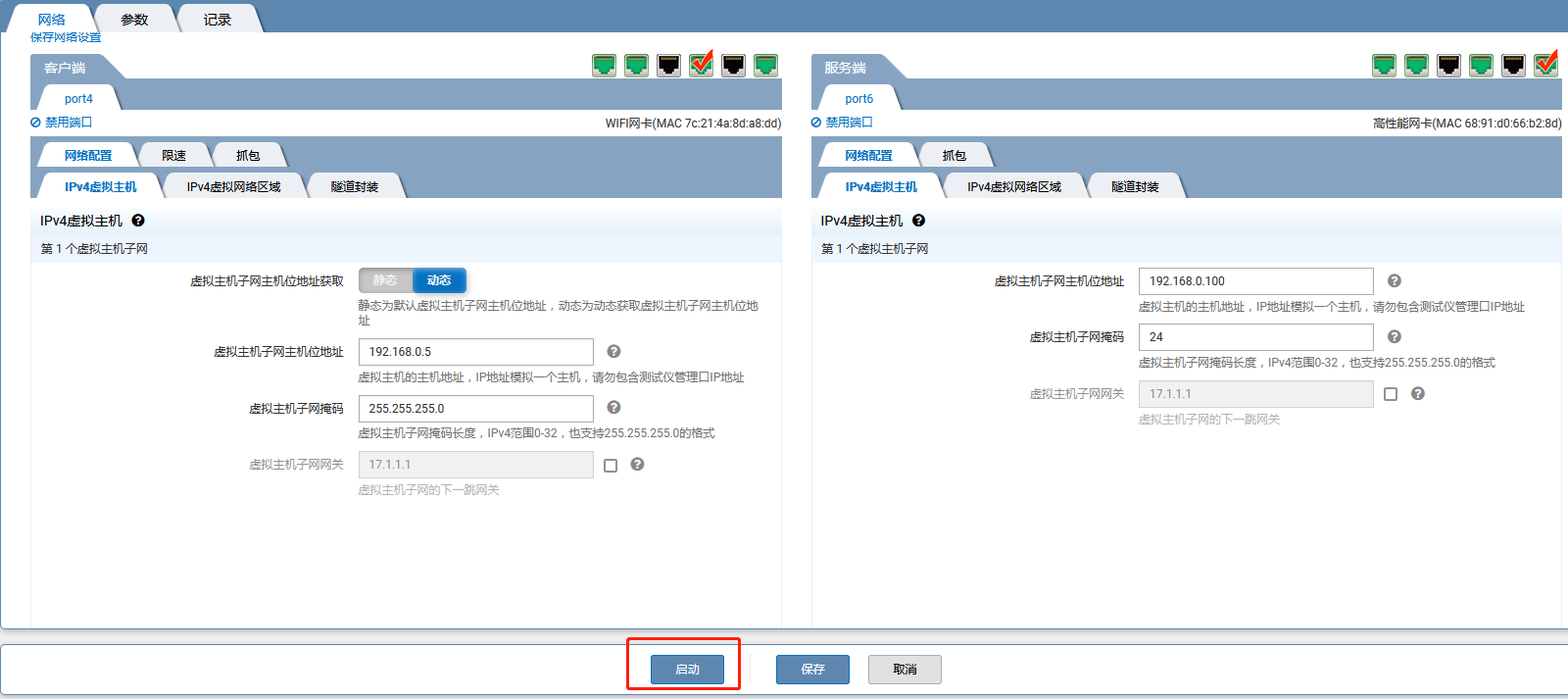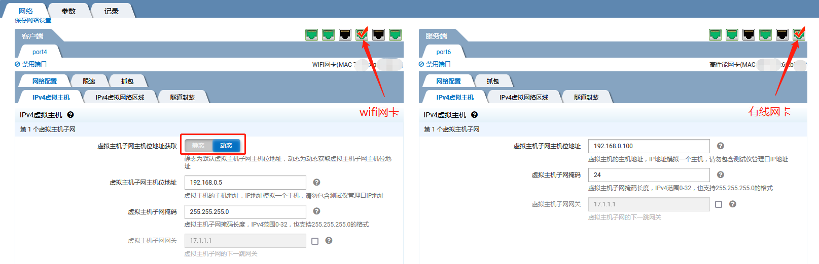 有线网卡port6作为接收端,手动填写一组同网段地址。例如填写192.168.0.100/24