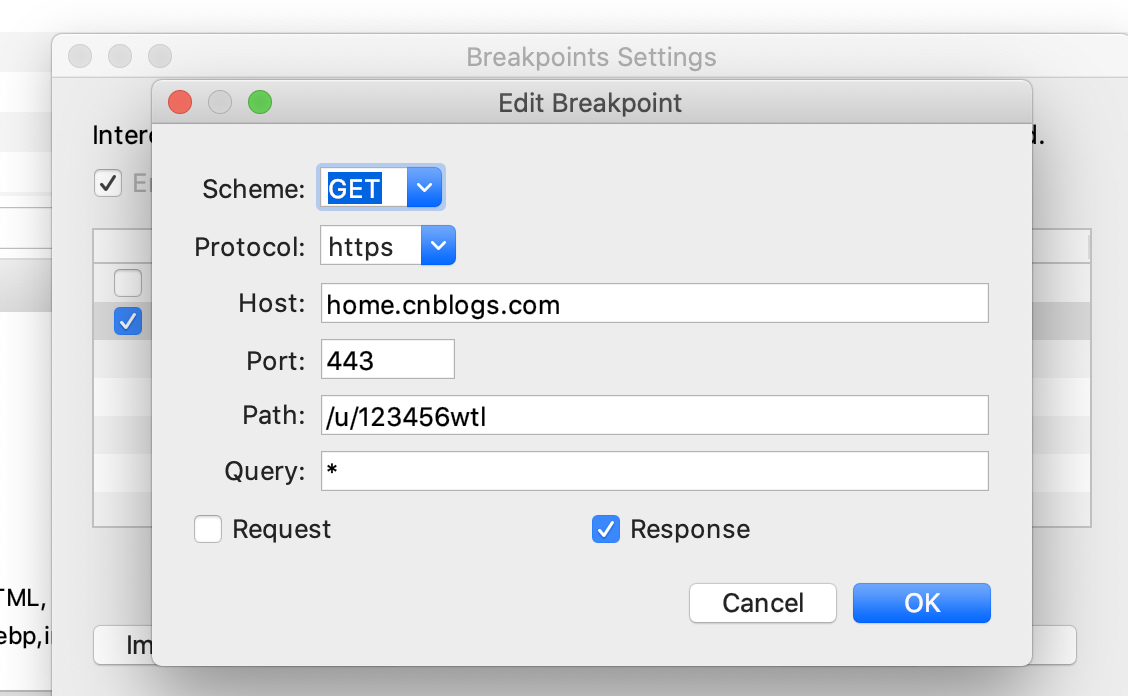 3、配置 Proxy ——>Breakpoint Settings,配置自己需要更改的接口