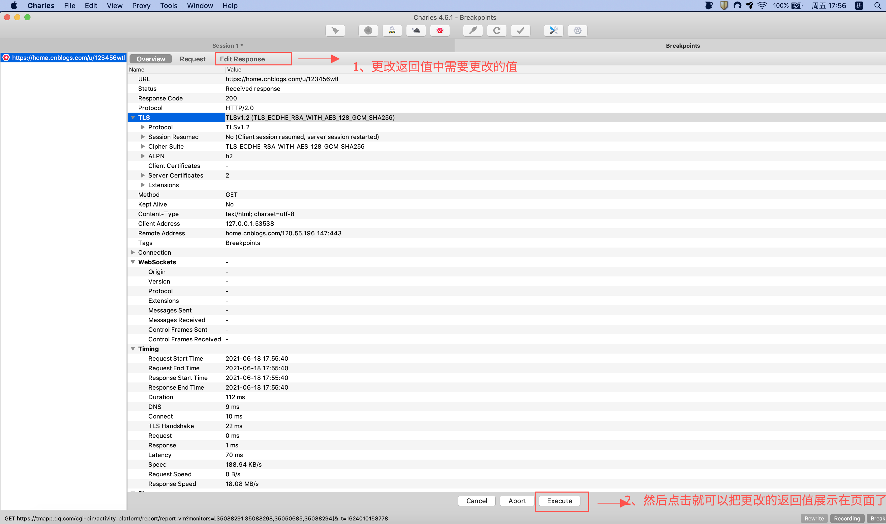 4、配置完成点击ok, 重新再跑一下接口。 当跑到设置断点的接口时,网页会暂停,这个时候Charles进入breakpoints ,然后再edit response里进行更改自己需要更改的值,更改完成后最后点击Execute 就OK了,再去页面查看就更改成功