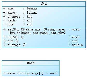 属性:学号(String)、姓名(String)、语文成绩(int)、数学成绩(int)、物理成绩(int)