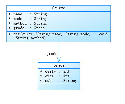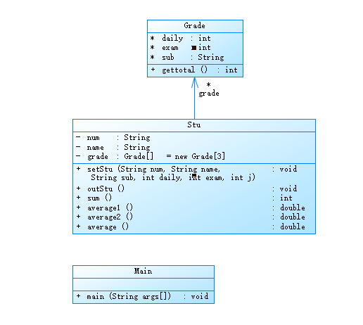 属性:学号(String)、姓名(String)、语文成绩(成绩类)、数学成绩(成绩类)、物理成绩(成绩类)