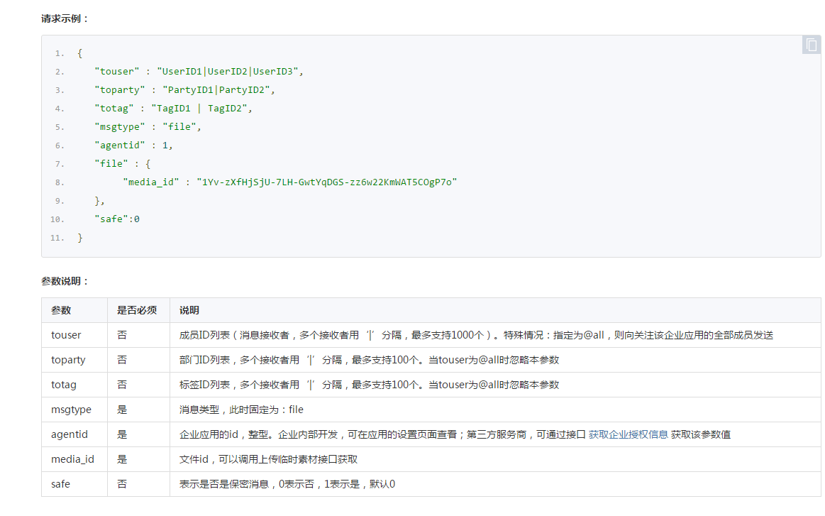 import com.alibaba.fastjson.JSONObject; import java.io.IOException; public class Test { public static void main(String[] args) { UploadMeida uploadMeida = new UploadMeida(); String fileType = "file"; String filePath = "src/main/resources/excel/工资条.xls"; WeChatMsgSend swx = new WeChatMsgSend(); try { String token = swx.getToken("你的corpID", "你的Secret"); JSONObject jsonObject = uploadMeida.UploadMeida(fileType, filePath); Object media_id = jsonObject.get("media_id"); String postdata = swx.createpostdata( "你要发送的账户名", "file", 1000002, "media_id", media_id); String resp = swx.post("utf-8", WeChatMsgSend.CONTENT_TYPE, (new WeChatUrlData()).getSendMessage_Url(), postdata, token); System.out.println("获取到的toke n======>" + token); System.out.println("请求数据======>" + postdata); System.out.println("发送微信的响应数据======>" + resp); System.err.println(media_id); } catch (IOException e) { e.printStackTrace(); } catch (Exception e) { e.printStackTrace(); } } }