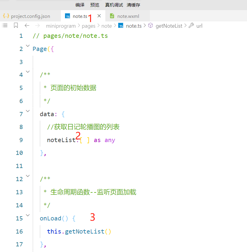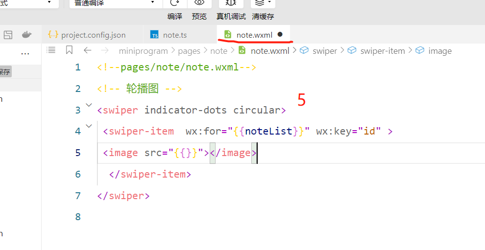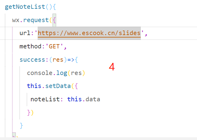 以上四步是创建轮播的基础,第二步再note.js文件中,第二步在date中创建noteList数组,第三步是在换页面的时候可以立即加载页面所拥有的文件,第四步是在note.js文件中创建getNoteList函数来创建轮播的获取方式。