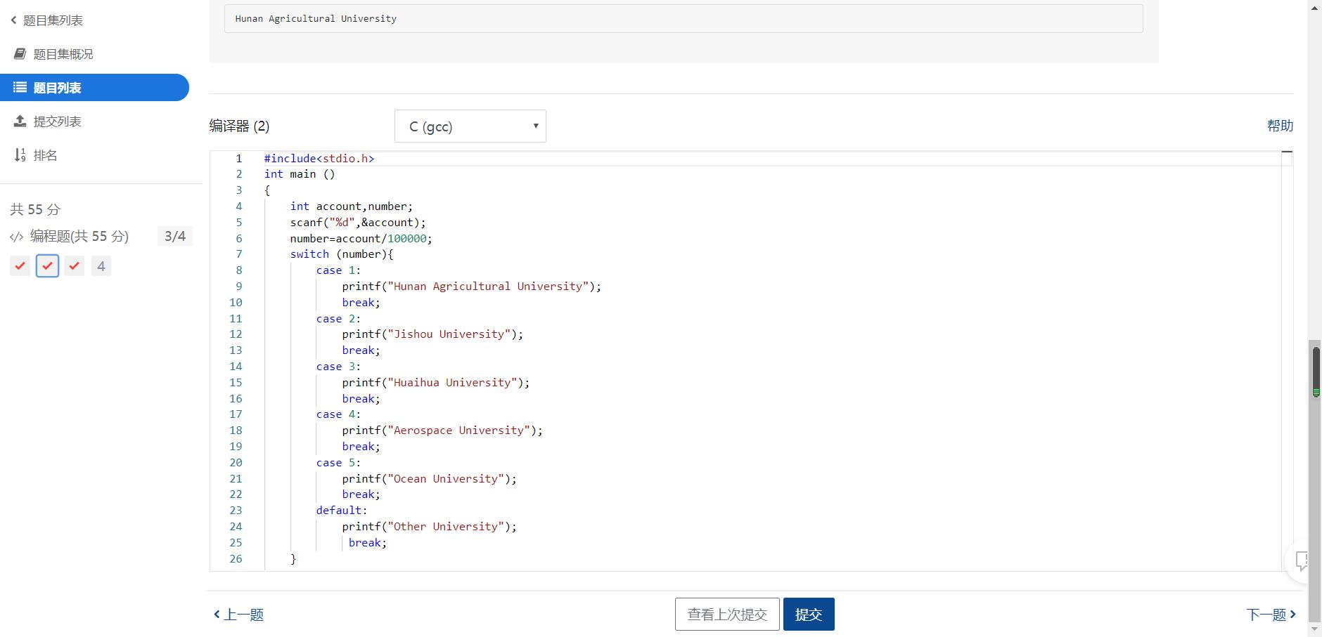 定义两个变量,输入学号,使用switch语句,找到对应的方案,输出学校。