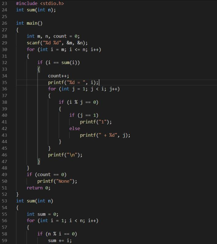 所谓完数就是该数恰好等于除自身外的因子之和。例如:6=1+2+3,其中1、2、3为6的因子。本题要求编写程序,找出任意两正整数m和n之间的所有完数。