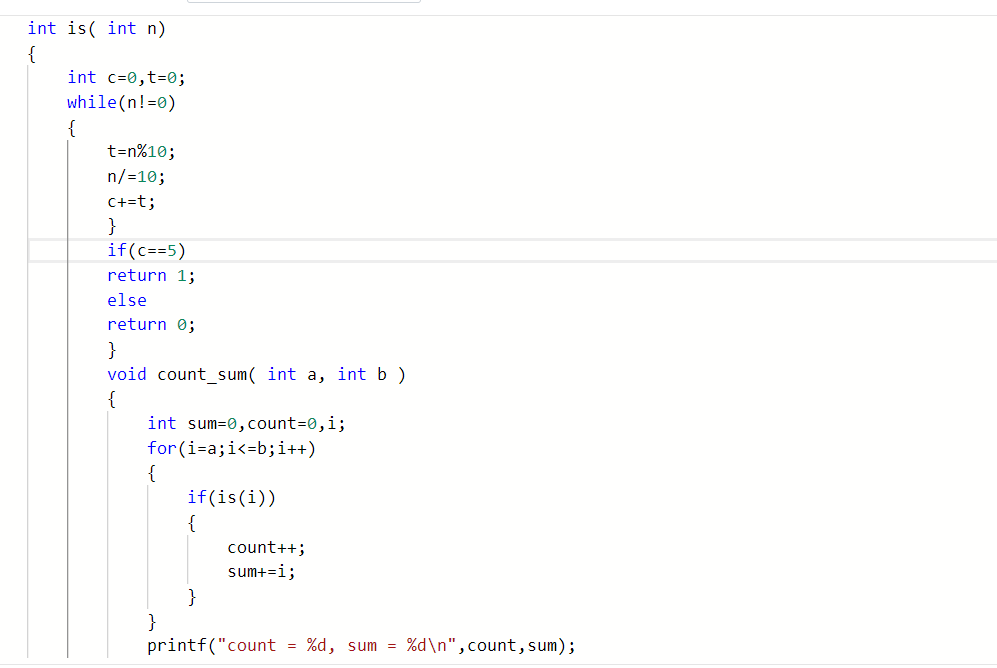 本题要求实现两个函数:一个函数判断给定正整数的各位数字之和是否等于5;另一个函数统计给定区间内有多少个满足上述要求的整数,并计算这些整数的和。