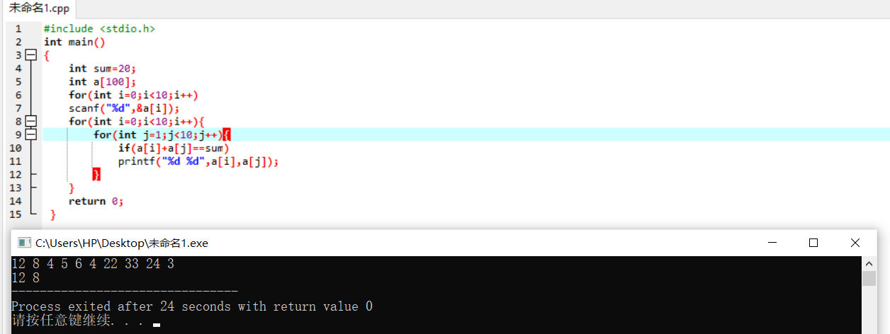 解法一:采用穷举法,从数组中任意取出两个数字,计算两者之和是否为给定的数字。