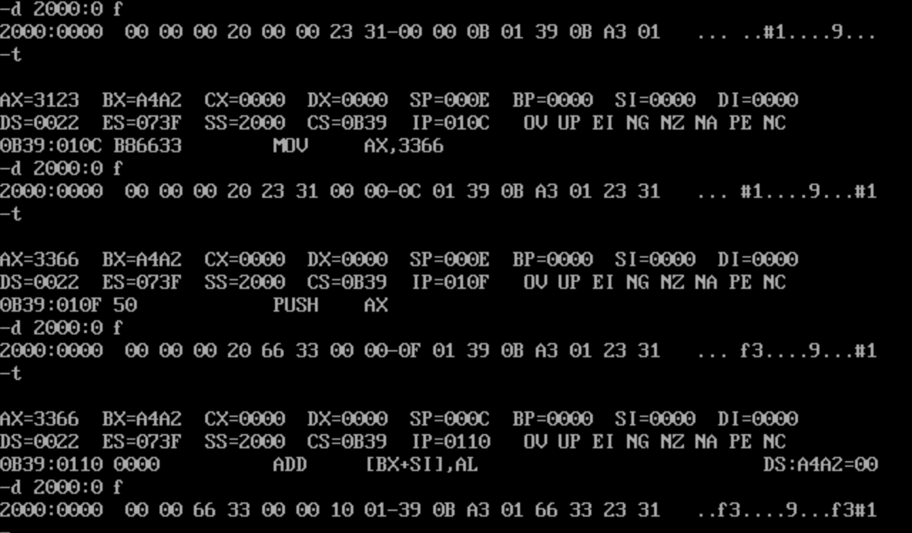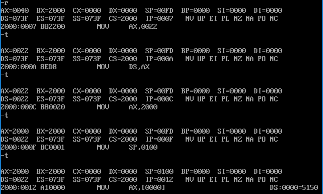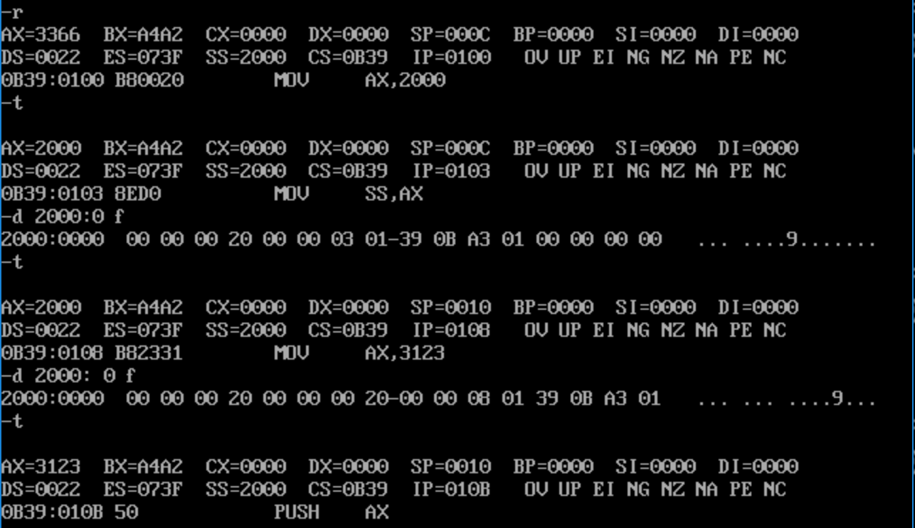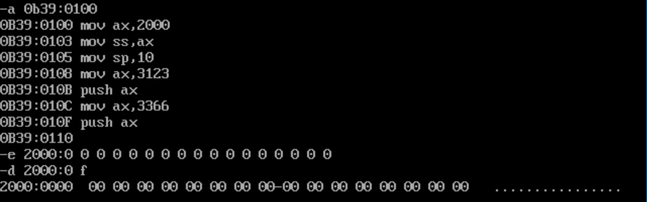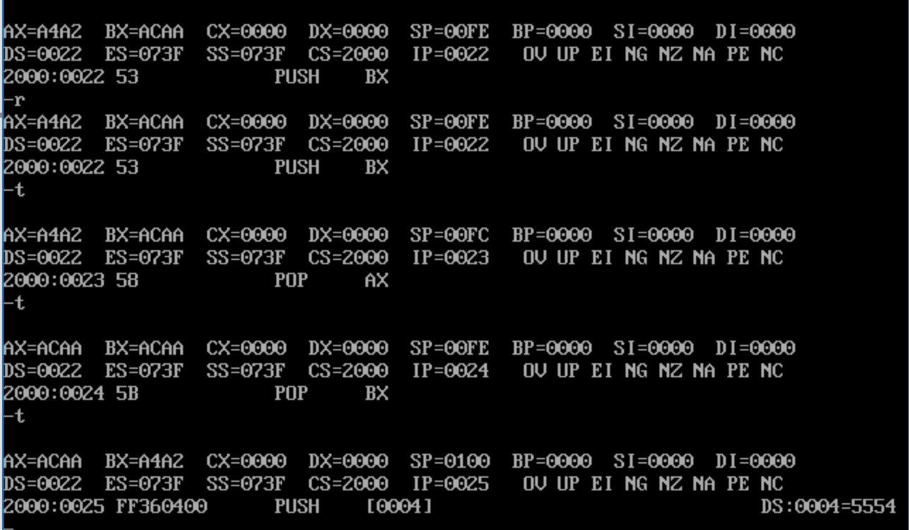 通过查阅资料,知道了dos系统下只有一个栈,除了push和pop操作以外,该栈还需要暂存寄存器指令,例如cs,ip的数据。所以执行完几条指令后栈里已经有了数据,而并非等到push或pop操作栈里才有数据。