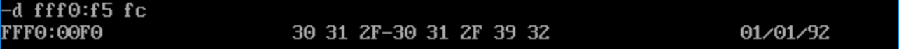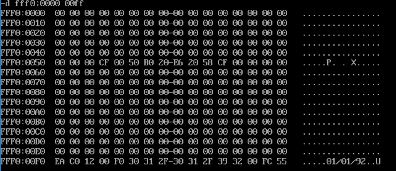通过d命令找到在内存单元FFF0:00F0开始显示生产日期。