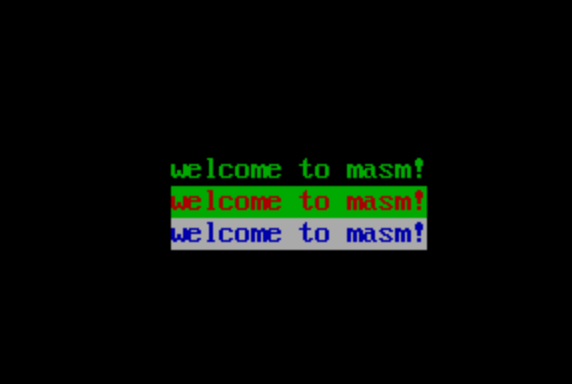 1 assume cs: code,ds: data 2 3 data segment 4 db 119,101,108,99,111,109,101,32,116,111,32,109,97,115,109,33 ;welcome to masm!(不包含属性值) 5 data ends 6 7 code segment 8 start: 9 mov ax, 0b800h 10 mov ds, ax ;设置内存段地址 11 mov bx, data 12 mov es, bx ;data段的段地址 13 14 mov di, 0 ;第一行 15 mov bx, 1984 ;根据计算,在屏幕的正中间为160*12+64 16 mov cx, 16 17 s0: 18 mov al, es:[di] 19 20 mov [bx], al ;ascii 21 inc bx 22 mov word ptr [bx], 2 ;feature, 0 000 0 010 23 inc bx 24 25 inc di 26 loop s0 27 28 mov di, 0 ;第二行 29 mov bx, 2144 ;在第一行的基础上+160 30 mov cx, 16 31 s1: 32 mov al, es:[di] 33 34 mov [bx], al ;ascii 35 inc bx 36 mov word ptr [bx], 36 ;绿地红色 0 010 0 100 37 inc bx 38 39 inc di 40 loop s1 41 42 mov di, 0 ;第三行 43 mov bx, 2304 ;在第二行的基础上+160 44 mov cx, 16 45 s2: 46 mov al, es:[di] 47 48 mov [bx], al ;ascii 49 inc bx 50 mov word ptr [bx], 113 ;白底蓝色 0 111 0 001 51 inc bx 52 53 inc di 54 loop s2 55 56 mov ax, 4c00h 57 int 21h 58 59 code ends 60 end start