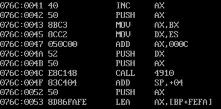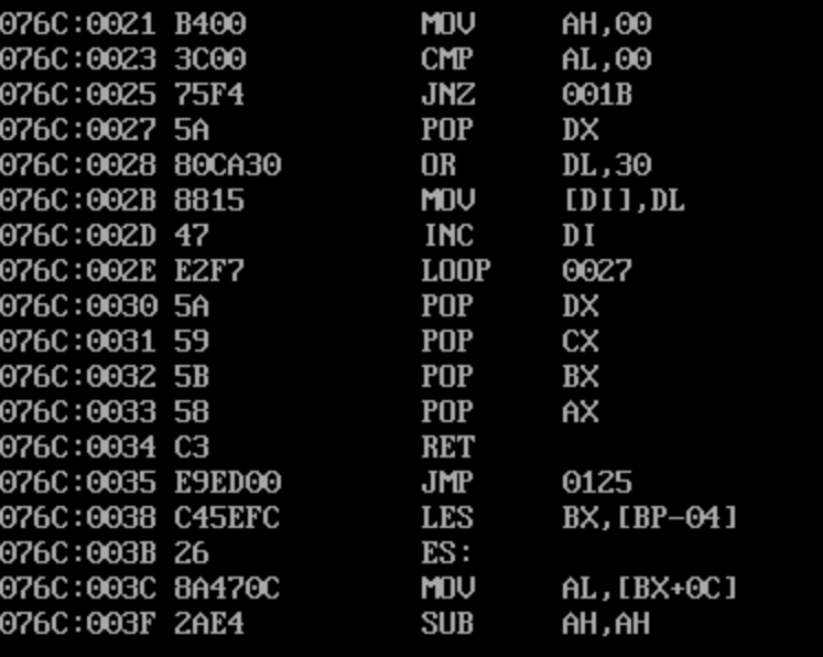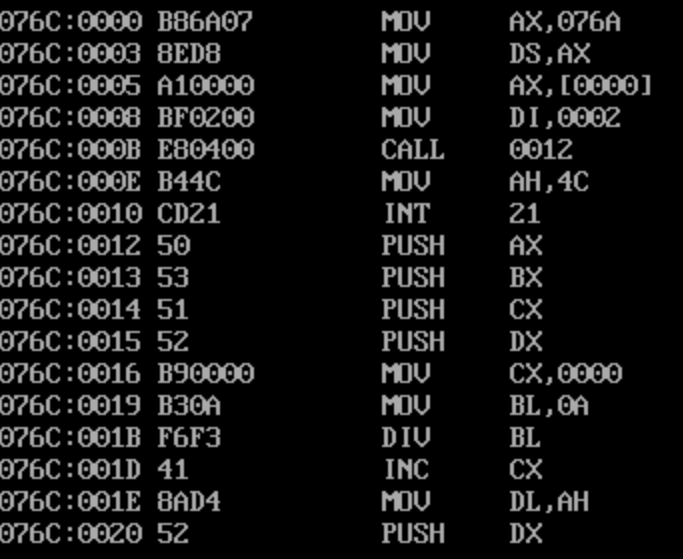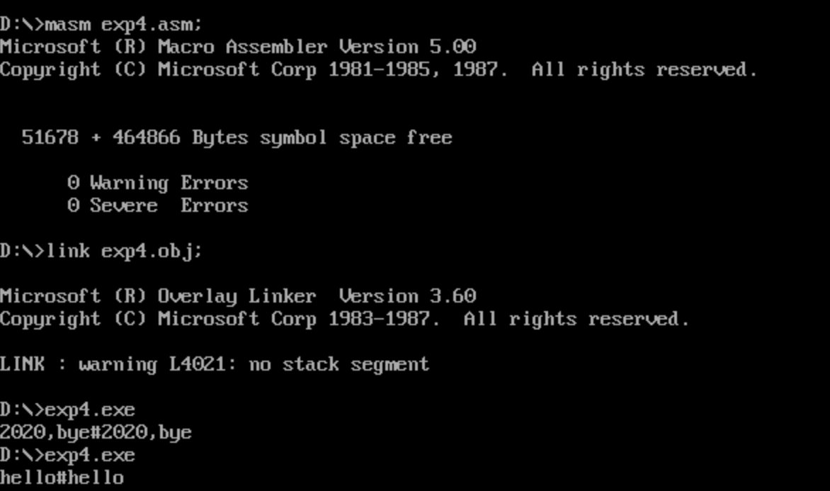 1 assume cs:code, ds:data 2 data segment 3 str db 80 dup(?) 4 data ends 5 code segment 6 start: 7 mov ax, data 8 mov ds, ax 9 mov si, 0 10 s1: 11 mov ah, 1 12 int 21h 13 mov [si], al 14 cmp al, '#' 15 je next 16 inc si 17 jmp s1 18 next: 19 mov cx, si 20 mov si, 0 21 s2: mov ah, 2 22 mov dl, [si] 23 int 21h 24 inc si 25 loop s2 26 mov ah, 4ch 27 int 21h 28 code ends 29 end start