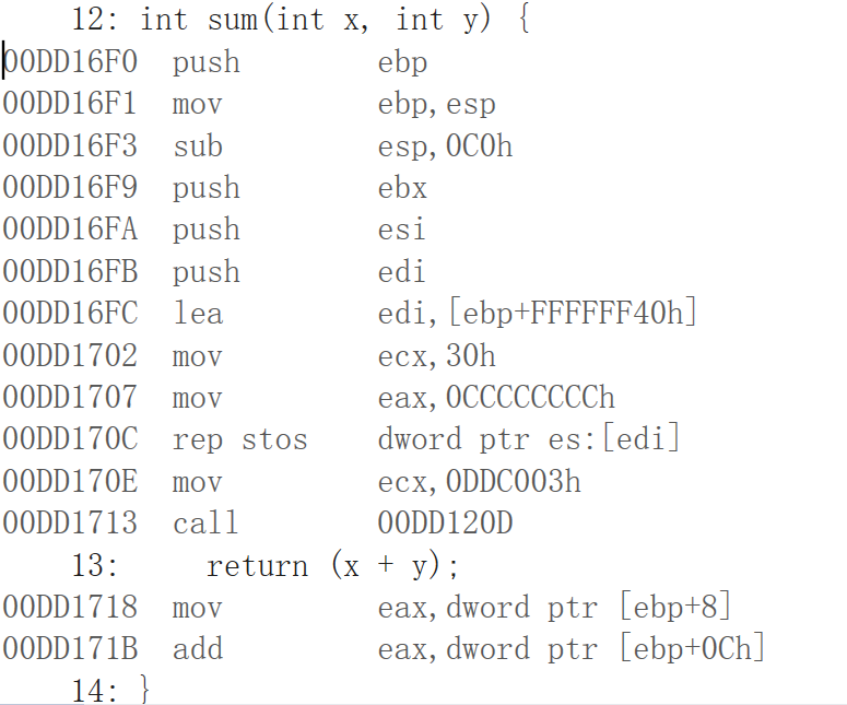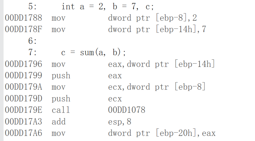 观察反汇编过程,发现函数的参数入栈顺序与形参的顺序相反。例如sum函数的形参顺序是a,b,参数的实际入栈顺序为b,a,返回值通过寄存器(本实验中为eax)返回。