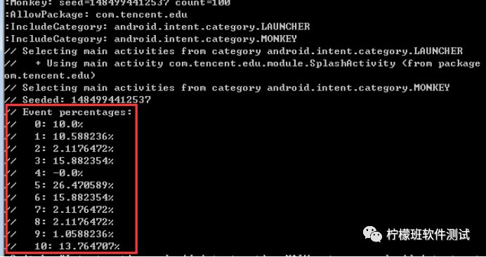 例:adb shell monkey -p com.tencent.edu --pct-touch 10 -v -v 100