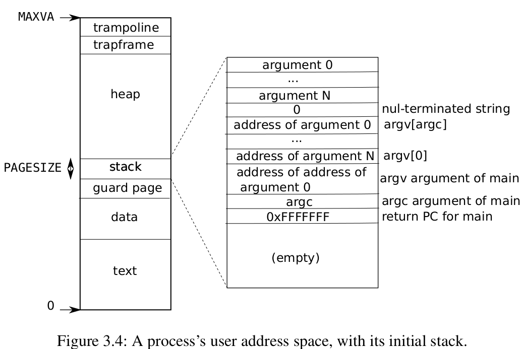 举个例子来说,比如shell要运行一个程序,首先通过fork来创建进程,allocproc会映射user address space顶部的trampoline和trapframe(用于处理trap),然后exec把可执行文件载入到text和data中,然后分配stack和gurde page。(注:写了lab5 lazy allocation以后,可以发现在fork和exec之间还需要sbrk来申请空间)