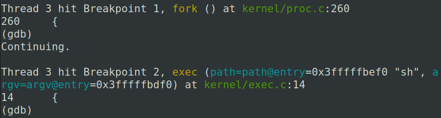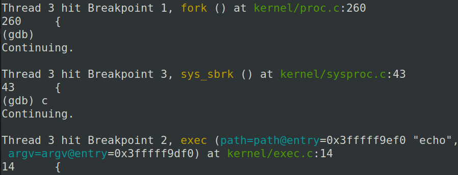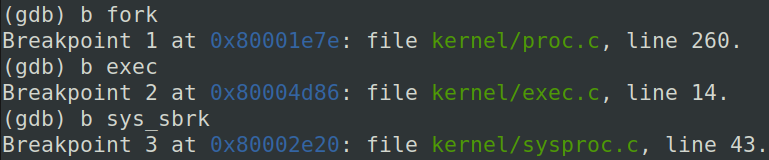 在fork,exec以及sys_sbrk上设置断点,continue,可以发现: