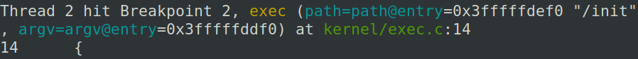 中间多了一步sys_sbrk,用于扩大空间,然后载入并执行echo,此时在0x1a处设置断点(使PC停留在执行完