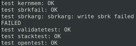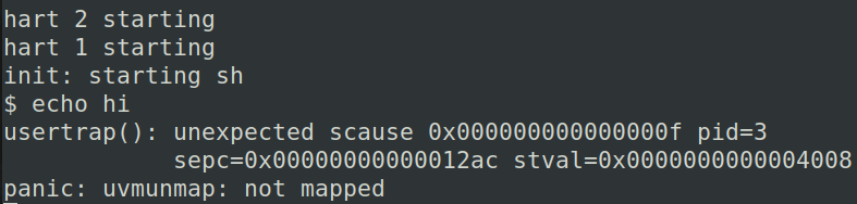 Store/AMO page fault,大概的意思就是说在写入page时发生了错误,这与我们的预期是符合的,因为新的sbrk只是将sz提高了,但没有真正分配物理内存(通过uvmalloc)。所以当对这些地址进行写操作的时候就会出错。 -