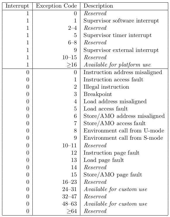 trap.c中的usertrap函数中,scause寄存器记录进入trap的原因,下表是scause的值及原因