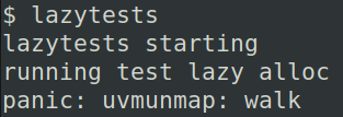 void uvmunmap(pagetable_t pagetable, uint64 va, uint64 npages, int do_free) { //... for(a = va; a < va + npages*PGSIZE; a += PGSIZE){ if((pte = walk(pagetable, a, 0)) == 0) panic("uvmunmap: walk"); if((*pte & PTE_V) == 0) // panic("uvmunmap: not mapped"); continue; if(PTE_FLAGS(*pte) == PTE_V) panic("uvmunmap: not a leaf"); if(do_free){ uint64 pa = PTE2PA(*pte); kfree((void*)pa); } *pte = 0; } }此时运行已经可以成功了