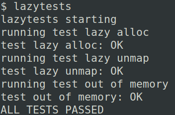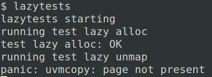usertrap中完成相应的解决方案void usertrap(void) { //... } else if (r_scause() == 15 || r_scause() == 13) { if (r_stval() >= p->sz || r_stval() <= p->trapframe->sp) { p->killed = 1; } else { uint64 va = PGROUNDDOWN(r_stval()); uint64 pa = (uint64)kalloc(); if (pa == 0) { p->killed = 1; } else { memset((void *)pa, 0, PGSIZE); if (mappages(p->pagetable, va, PGSIZE, pa, PTE_W | PTE_R | PTE_U) != 0) { kfree((void *)pa); p->killed = 1; } } } } else { //... }我们来运行一下: