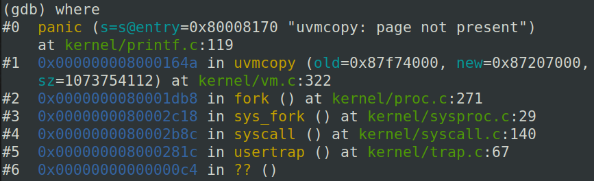 众所周知,fork的作用是crear a new process, copying the parent.,里面调用uvmcopy函数来将父进程的user memory复制进子进程(通过pagetable),uvmcopy和uvmunmap很相似,因为父进程有的page实际并不存在((*pte & PTE_V) == 0),所以就panic了。解决方法也很简单,对于这种page直接跳过即可。