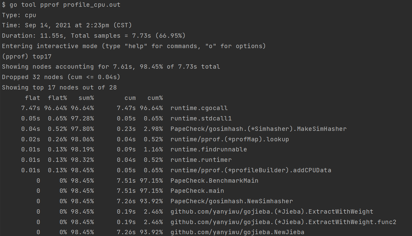go test -run=xxx -bench=. -benchtime="10s" -cpuprofile profile_cpu.out