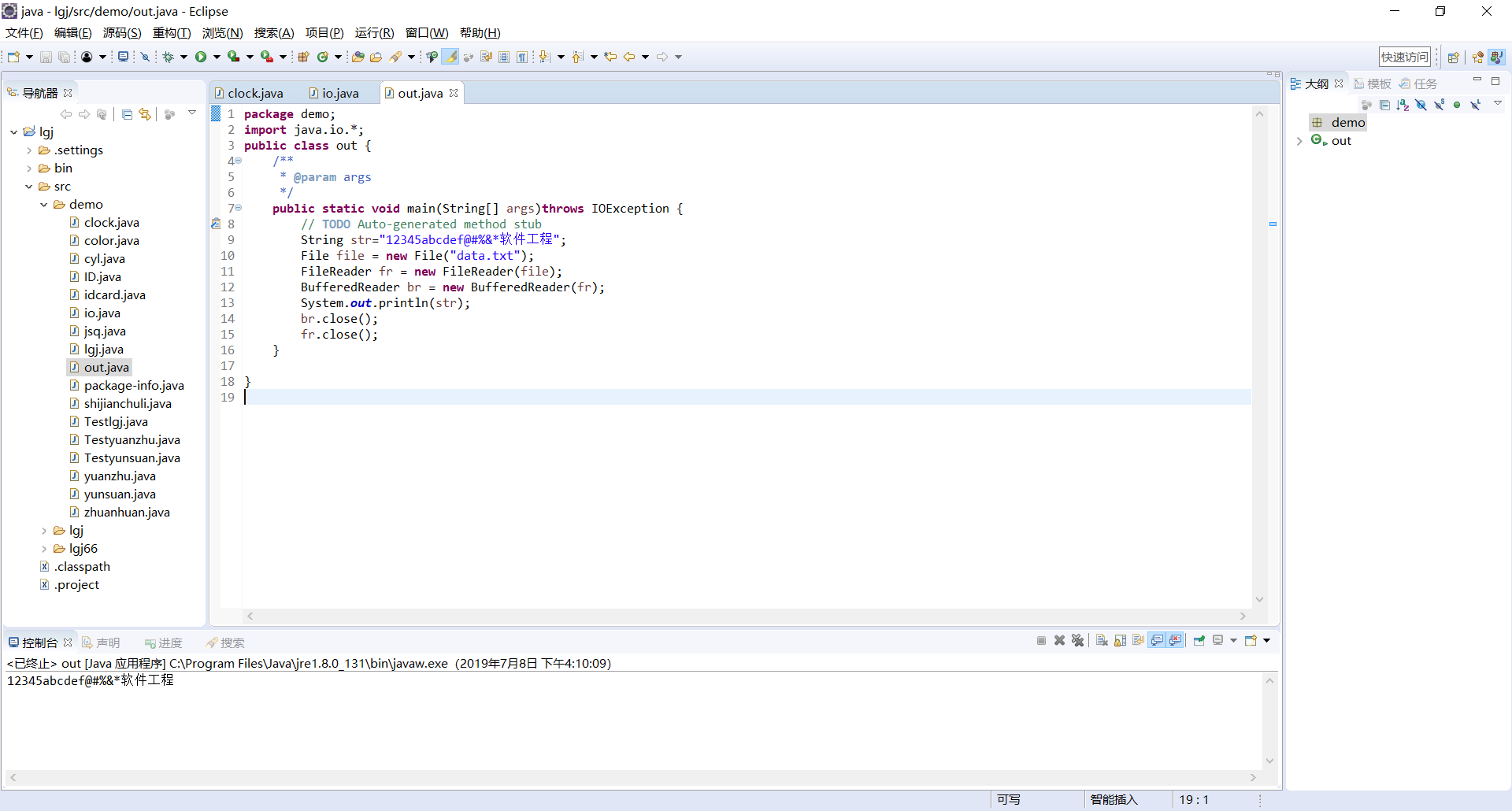文件输出流的应用。 定义如下字符串: String str = “12345abcdef@#%&*软件工程”; 编写程序将该字符串写入文件”data.txt”。 文件输入流的应用。 修改第1题中的程序,读文件”data.txt”,将读到的数据输出在控制台。 谈一谈本次实训的体会。