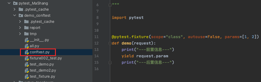 conftest.py说明:该文件可实现全局的前后置应用;名称固定,不可更改(同pytest.ini文件)--可在不同目录定义多个该文件