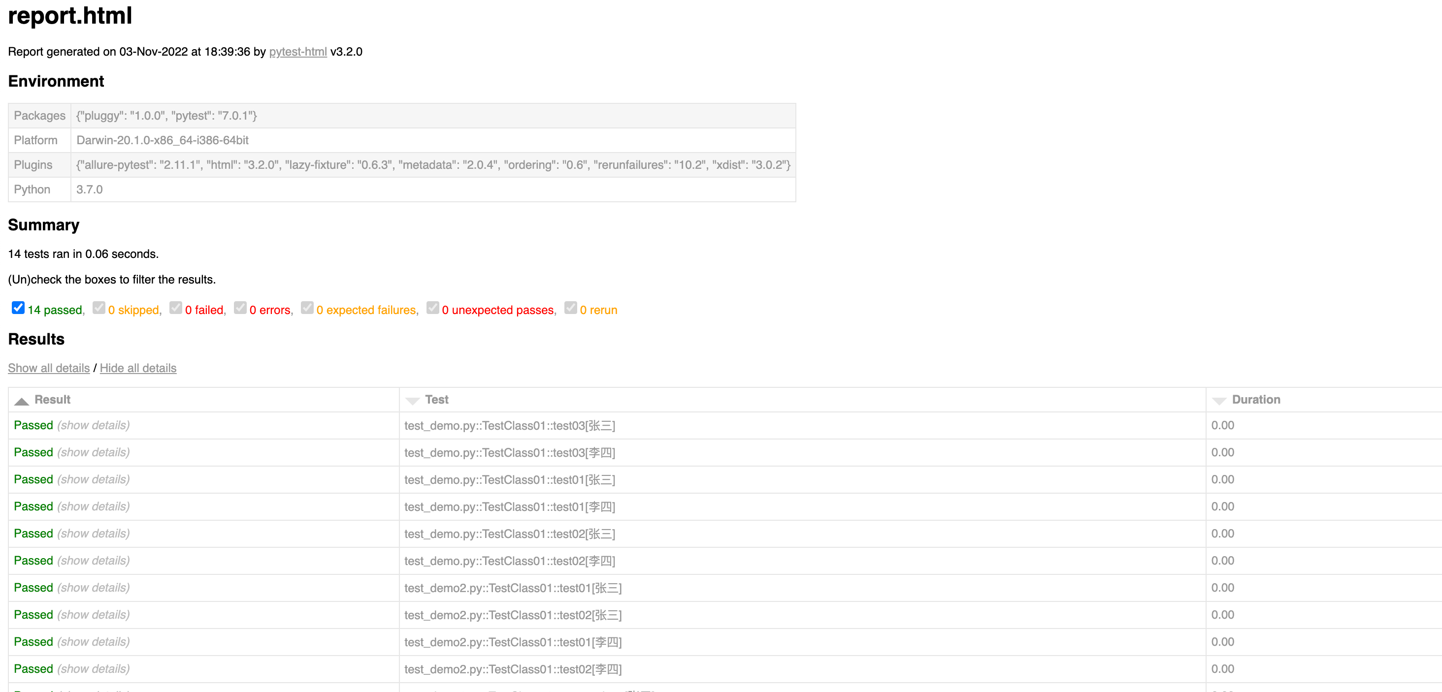 注意:此时,生成的报告,html信息和css等文件在不同的文件,如果需要合并执行一下命令:pytest -svv test_demo.py test_demo2.py --html=./report/report.html --self-contained-html