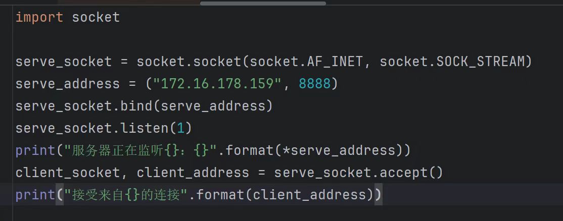 然后再进行代码构建,使服务器程序可以接受客户端的链接,并提示“接受来自 的链接”,此处会显示客户端的IP地址。