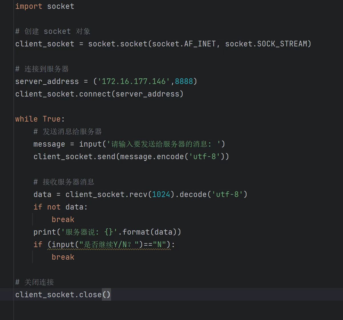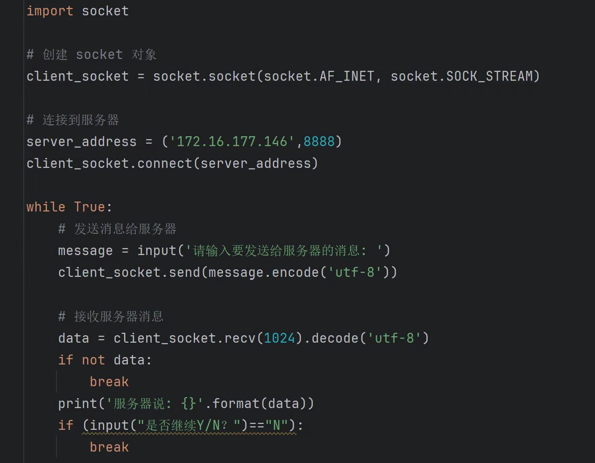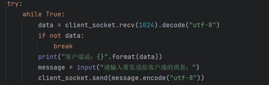 然后利用while和if语句构建循环,使得客户端能够不断向服务器发送消息,同时能够接收服务器发过来的消息。