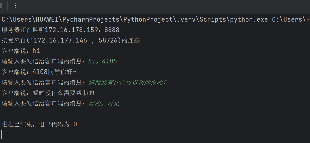 分别在服务器与客户端上运行代码。这里我与我的同桌高睿晗搭档,进行了一些简单的对话。