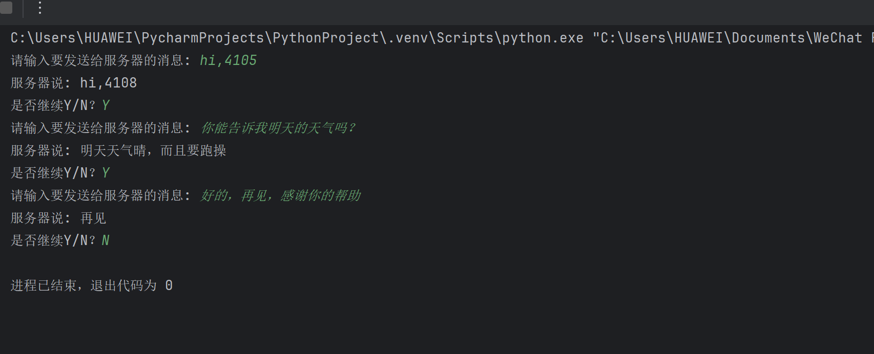 同时会跳出提示“是否继续Y/N?”,若是选择了Y则循环继续进行,客户端可以继续向服务器发送消息;选择了N则进程停止,退出循环。