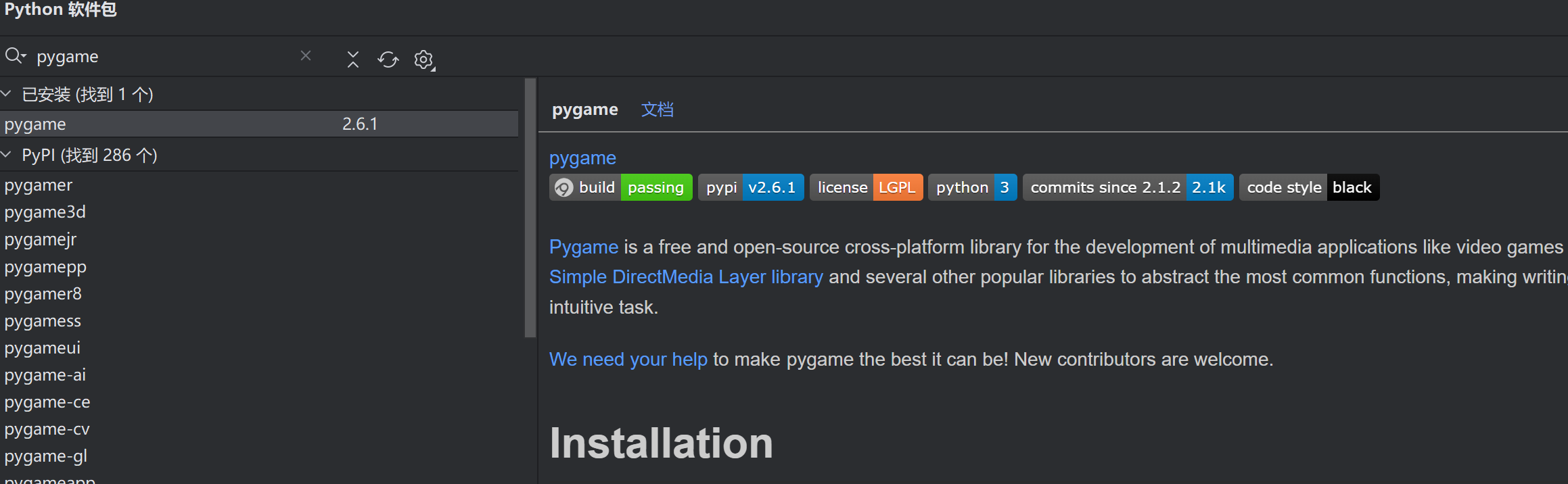 (1)为了满足游戏进行的需要,在程序编写前须先在Pycharm上下载pygame。