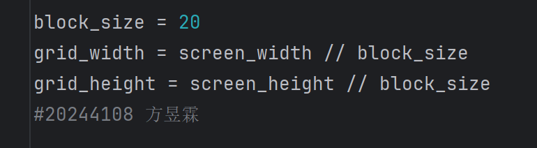 然后再使用grid_width = screen_width // block_size 和 grid_height = screen_height // block_size 两个函数来根据窗口宽度和高度以及方块大小计算出游戏区域在水平和垂直方向上的网格数量,用于后续方块位置的计算和布局。