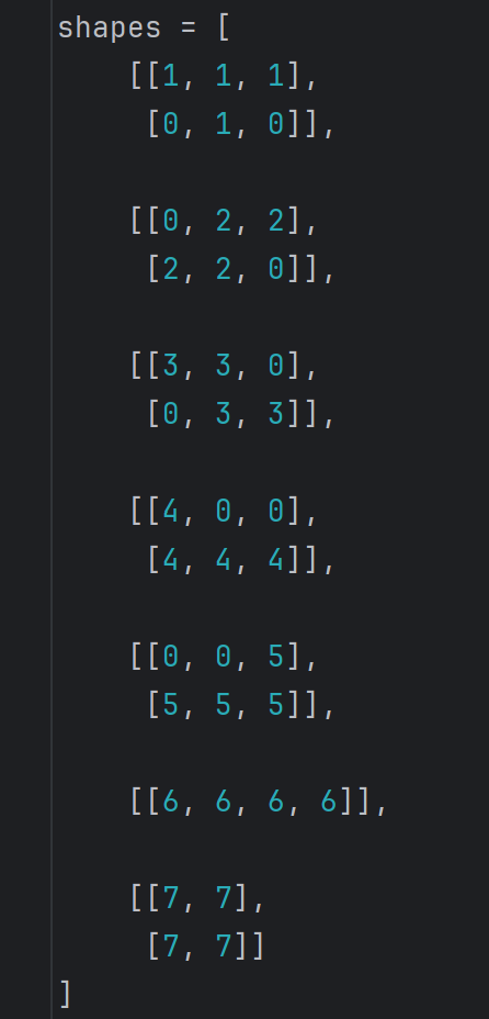 shapes是一个列表,其中每个元素代表一种俄罗斯方块的形状,每个形状由一个或多个子列表表示,子列表中的数字代表方块在形状中的位置,数字相同表示属于同一个方块部分。