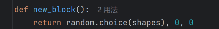 这里定义了一个新的函数new_block来实现这个功能,随机从上面的shapes列表中选择一种方块形状,并返回该形状以及它在游戏区域中的初始x、y坐标,即最上方的中间位置。