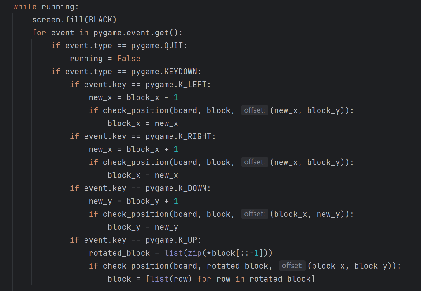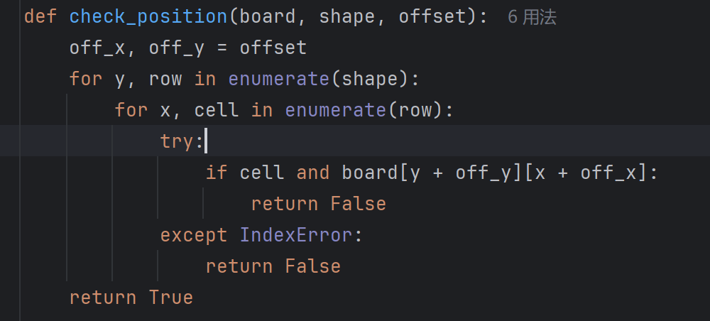 这里的自定义函数def check_position(board, shape, offset) 用于检查方块在指定位置是否合法。