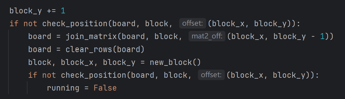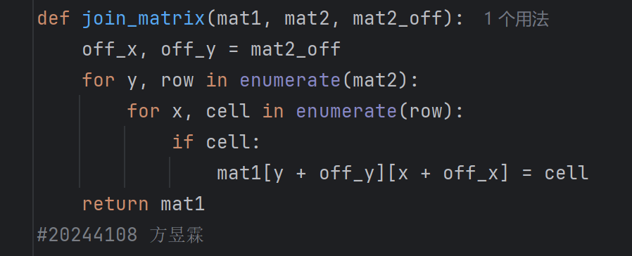 这里就是自定义一个join_matrix的函数,作用是把一个方块矩阵拼到游戏棋盘矩阵上,也就是游戏中的放置方块。