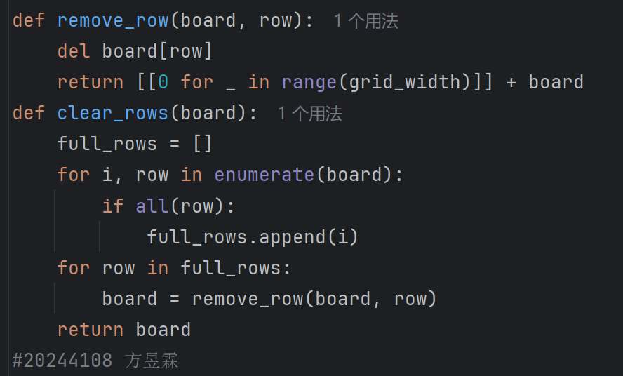 在俄罗斯方块中,如果一行被方块填满了,那该行就可以被消除。这里使用了def clear_rows(board)来实现这个功能,定义函数用于检查并清除游戏棋盘中的满行。