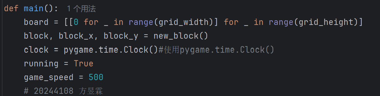 最后,再检查这个新方块的初始位置合不合法,不合法则游戏结束,退出循环,这一步由ifnotcheck_position(board,block,(block_x,block_y))及其后续操作来实现。